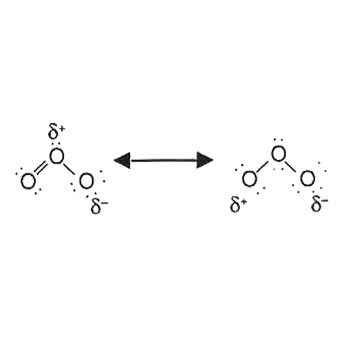 The symbols d+ en d- shows that ozone molecules are short of electrons on the locations where these signs occur. This means that ozone is a dipolar molecule. This causes ozone to have characteristic properties. Ozone reacts very selectively and is electrophilic.